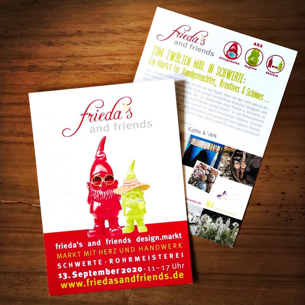Am Sonntag, den 13. September ist es endlich wieder soweit, denn dann heißt es: staunen, stöbern und shoppen auf dem „frieda’s and friends design.markt“ in Schwerte. Die beiden Organisatorinnen Katrin Schulz und Vera Conrad laden nun bereits zum zwölften Mal in die Rohrmeisterei ein. Mit dabei sind wie immer großartige Künstler, Designer und Kreative, die ihre ausgefallenen Unikate anbieten.