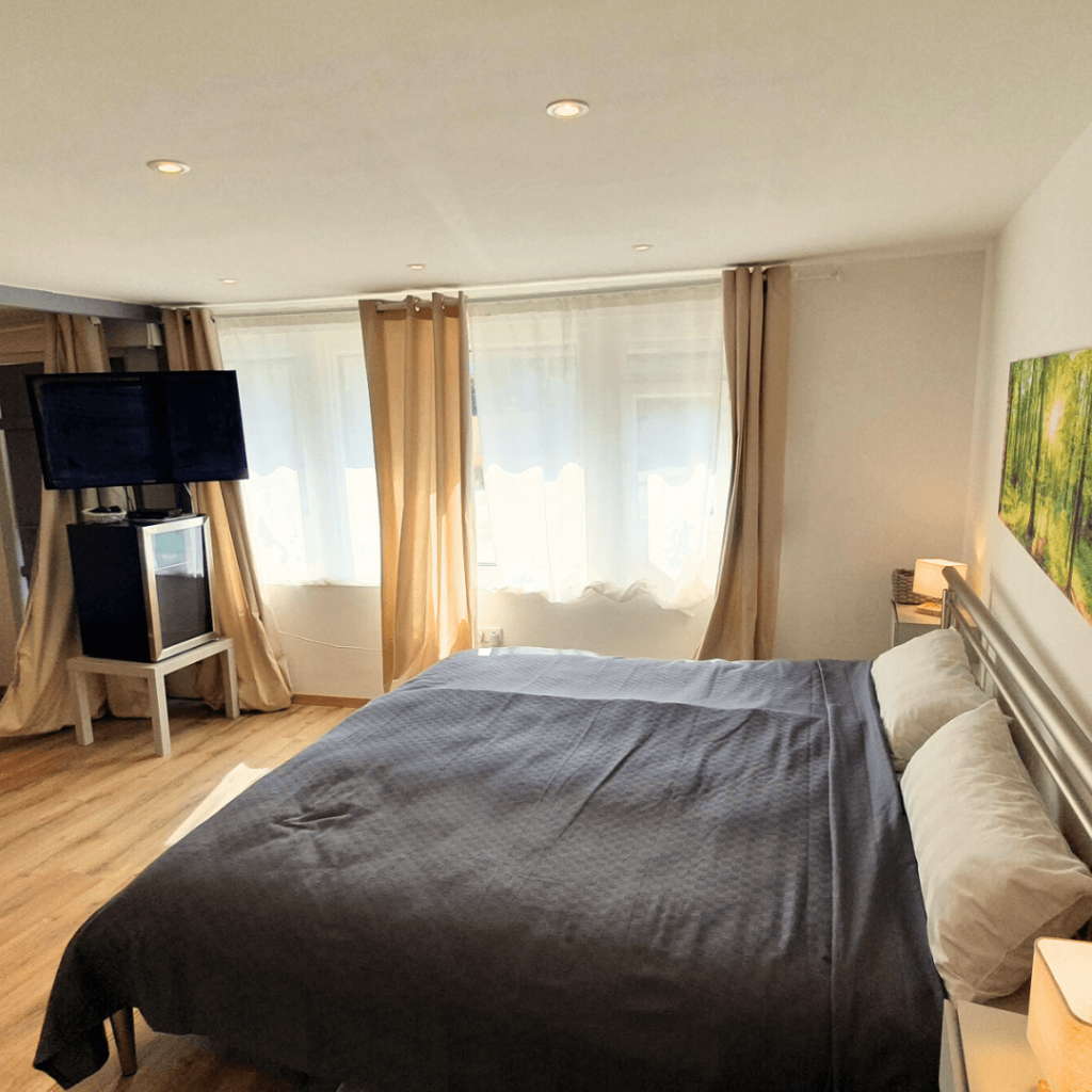 Zur Ausstattung gehören außerdem WLAN, TV, eine Mini-Bar, Seife, Haartrockner und eine kleine, aber feine Küchenzeile ohne Geräte, an der Kaffee und Tee kochen möglich ist.