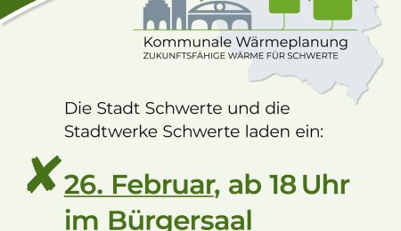Am 26. Februar 2026 um 18 Uhr findet im Bürgersaal des Rathauses Schwerte eine öffentliche Beteiligungsveranstaltung zur Kommunalen Wärmeplanung statt. Zunächst werden die Ergebnisse des Entwurfs vorgestellt. Bürger*innen haben dann an mehreren Thementischen die Möglichkeit, Fragen zu stellen und Anregungen einzubringen. Zudem wird über verschiedene Energieberatungsangebote informiert.
