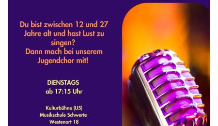 Am Dienstag, dem 27.01. findet die erste Probe des neuen Jugendchores der Musikschule statt. Wer zwischen 12 und 27 Jahre alt ist und Lust hat zu singen, darf gerne einfach vorbeischauen.